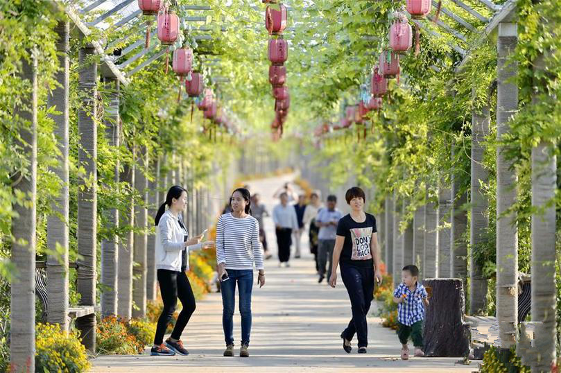 游客在河北省巨鹿縣金玉莊村金銀花園藝小鎮(zhèn)內(nèi)游覽