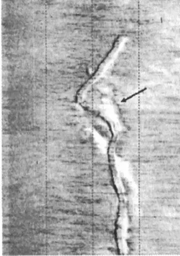 本實例為上海京海工程技術(shù)公司上級單位中國地質(zhì)科學院物化探研究所采用側(cè)掃聲納探測得到的資料。圖5是一段裸露于海底面上的電纜的側(cè)掃聲納圖像。該電纜為多年前采用水力噴射埋設(shè)方式鋪設(shè),但是由于鋪設(shè)時未能準確的將該電纜放入噴射出的溝槽內(nèi),從而導致該電纜露在海底面上。