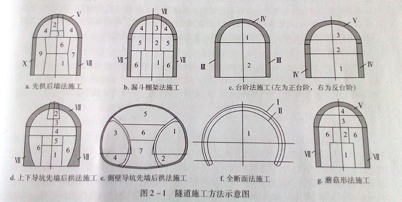 又有正臺(tái)階法和反臺(tái)階法之分(圖2 -lc)。①正臺(tái)階法系在穩(wěn)定性較差的巖層中施時(shí),將整個(gè)坑道斷面分為幾層,由上向下分部進(jìn)行開挖,每層開挖面的前后距離較小而成幾個(gè)正臺(tái)階。上部臺(tái)階的鉆眼作業(yè)和下部臺(tái)階的出碴,可以平行進(jìn)行而使工效提高。斷面完全開挖后,再由邊墻到頂拱筑襯砌。在坑道頂部最先開挖的第一層為一弧形導(dǎo)坑,需要鉆較多的炮眼,導(dǎo)坑超前距離很短,可使爆破時(shí)石碴直接拋落到導(dǎo)坑之外,以減少扒碴工作量,從而提高掘進(jìn)速度。如坑道頂部巖層松動(dòng),應(yīng)立即在導(dǎo)坑內(nèi)用錨桿或鋼拱架作臨時(shí)支護(hù),以防坍塌。②反臺(tái)階法則用于穩(wěn)定性較好的巖層中施工,也將整個(gè)坑道斷面分為幾層,在坑道底層先開挖寬大的下導(dǎo)坑,再由下向上分部擴(kuò)大開挖。進(jìn)行上層的鉆眼時(shí),須設(shè)立工作平臺(tái)或采用漏斗棚架,后者可供裝碴之用。