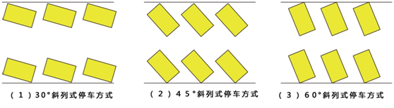 斜放式停車車身方向與通道成角度停放,一般有30°、45°、60°三種角度,如下圖所示。