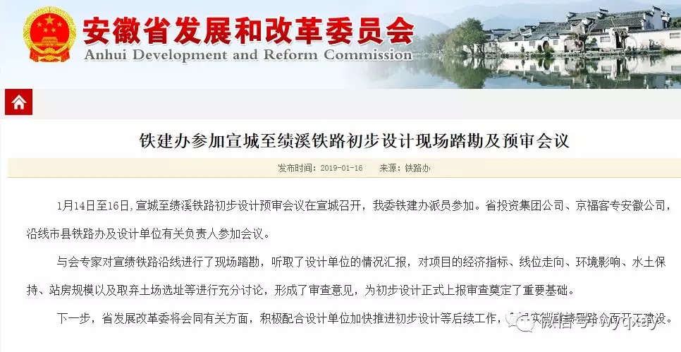 據省發改委鐵建辦消息,1月14日至16日,宣城至績溪鐵路初步設計預審會議在宣城召開,該委鐵建辦派員參加。省投資集團公司、京福客專安徽公司,沿線市縣鐵路辦及設計單位有關負責人參加會議。