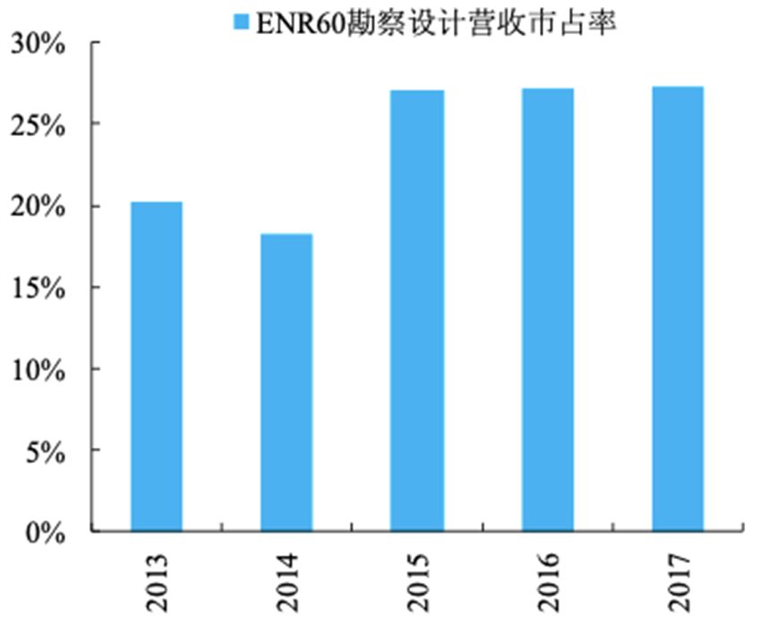 國內勘察設計行業集中度仍較低:對比國家統計局統計的行業營收數據及ENR60強營收數據看,一方面ENR60強營收集中度(全口徑)有所下滑(不足8%),我們認為或與承包業務較為分散有關,另一方面剔除承包業務后的勘察設計業務集中度雖從20%穩步提升到27%,但仍處于較低水平。
