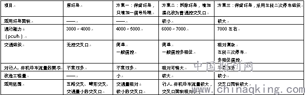 根據(jù)以上分析的環(huán)形交叉口可進行的改造方案,對各個方案見進行比較,結果如下表1。