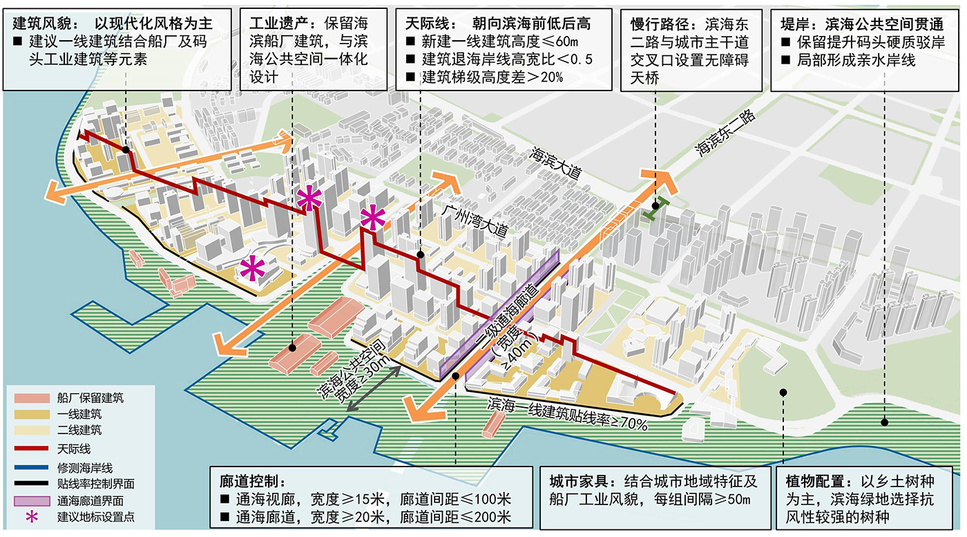 管控要點:結(jié)合船廠工業(yè)遺產(chǎn),垂直海岸線控制多條通海廊道。控制新建一線建筑高度≤60m,建筑退海岸線高寬比<0.5,建筑梯級高度差> 20%,形成由濱海向內(nèi)陸前低后高的天際線。