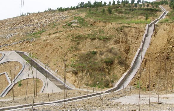 5.急流槽:在陡坡或深溝地段設置的坡度較陡、水流不離開槽底的溝槽稱作急流槽。急流槽的作用是在較短的距離內以溝渠的方式引排水流、降低水頭,進而防止沖刷(可用于比跌水更陡的坡度,可達600)。