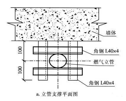 隨著建筑物層數的增加,燃氣立管的長度也變長,管道的自重變大,所以應設置管道的固定支架,使固定支架與建筑物成為一體,防止因管道下沉而引起引入管受力折斷或變形引起倒坡。一般固定管道的做法有: