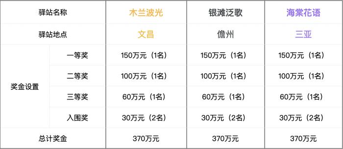 每個驛站分別設(shè)置一、二、三等獎及入圍獎,總獎金池達(dá)1,110萬元(稅前)。獎金情況公示如下: