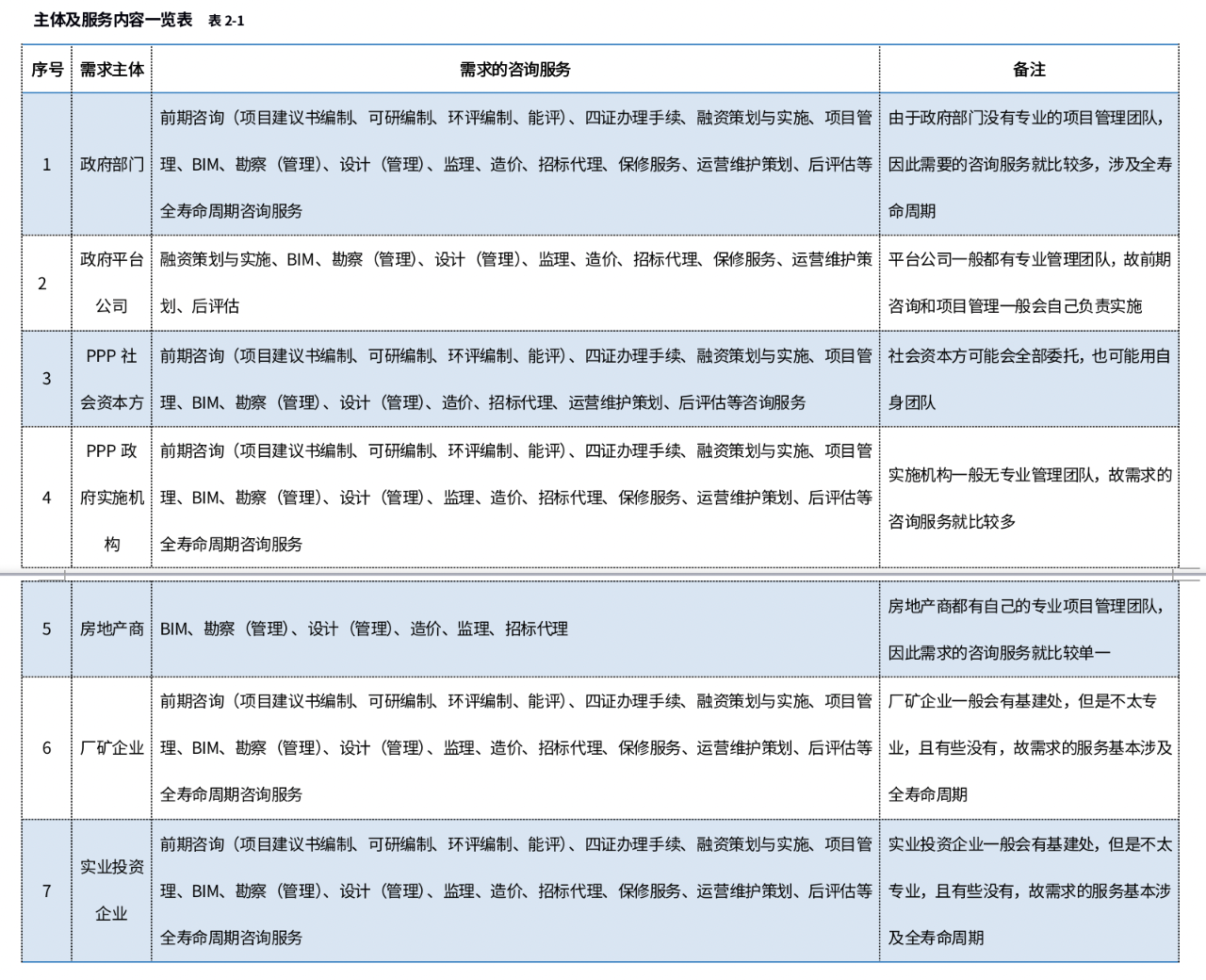 二、全過(guò)程工程咨詢服務(wù)內(nèi)容及需求主體