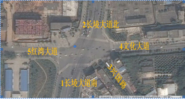 該交叉口位于江西省南昌市新建區(qū)中心城區(qū)西部。由長堎大道、紅灣大道、文化大道、興國路五路交叉組成。其中長堎大道南北方向雙向六車道主干道,紅灣大道、文化大道是連接新建區(qū)和灣里區(qū)的主要交通干道,興國路連接新建區(qū)中心城區(qū)并設有多條公交線路。該交叉處在新建區(qū)大力開發(fā)地段,周邊居民區(qū)密集、各道路沿途設有多家商業(yè)和購物中心,并輻射周邊的高校園區(qū)和工業(yè)園區(qū)。由于交叉口交通流量較大、多路相交,加上長堎大道建成通車后未能對交叉口各進出口道和內(nèi)部空間進行科學合理的交通渠化設計,導致交通混行,交通擁堵現(xiàn)象經(jīng)常發(fā)生。交叉口現(xiàn)狀如圖-1所示。