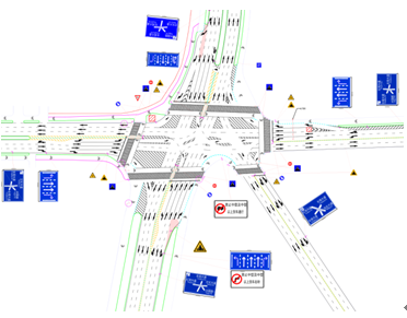 交叉口內(nèi)部區(qū)域采用導流線、行人過街安全島以及交通流向標志標識等進行渠劃設計。