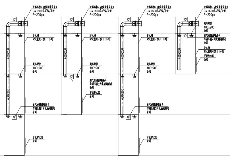 4. 管井內(nèi)燃?xì)夤芫鶠闊o縫鋼管,焊接連接,根據(jù)需要設(shè)燃?xì)忸A(yù)留閥(法蘭球閥或螺紋球閥),底部設(shè)排污閥。5.管井內(nèi)設(shè)燃?xì)鈱S梅派⒐?,根?jù)需要設(shè)預(yù)留閥(螺紋球閥),底部設(shè)排污閥,頂部應(yīng)引至室外安全處,出口作防雨彎頭。