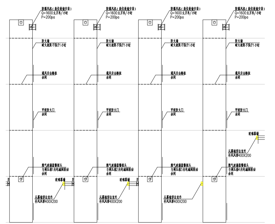 2. 管井內(nèi)樓層高度處作通風(fēng)安全隔柵或多孔水泥板(可站人),檢修門采用甲級防火門(600x1800);墻體采用防火墻,燃?xì)夤芫疄橐粋€(gè)獨(dú)立的防火分區(qū),燃?xì)夤芫恍∮?平方米,可進(jìn)人維修。